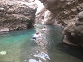 We dodged that pool and wandered up the wadi towards the series of pools we visited all those years ago. The first pool was relief. We got out of the heat that right away we were swimming. Through that pool and we shimmied around a camel spider, snake and some little pools. We came to a cross roads...